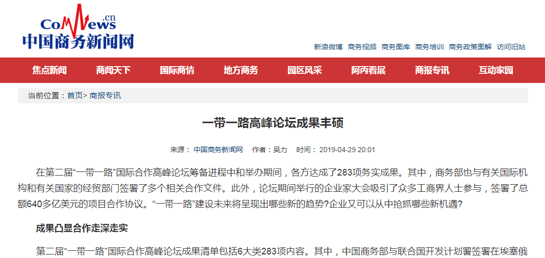 中國商務新聞網(wǎng):一帶一路高峰論壇成果豐碩