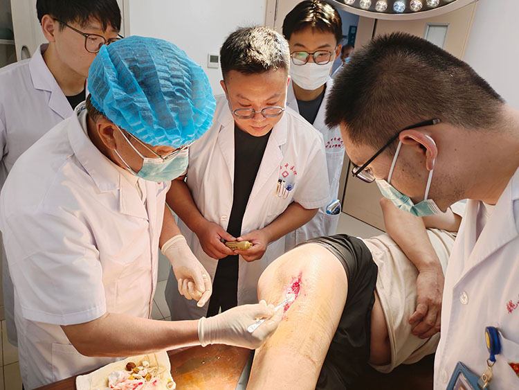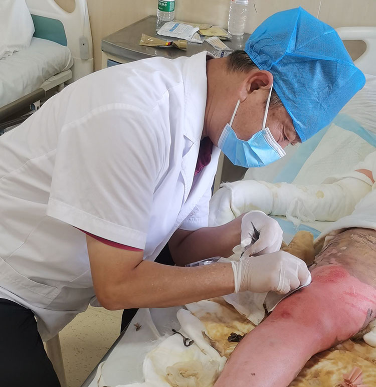 8月18日,應(yīng)河北魏縣中醫(yī)醫(yī)院之邀,再生醫(yī)學(xué)知名專家、《中國燒傷創(chuàng)瘍雜志》常務(wù)編委趙瑞慶主任,在該院會(huì)診了三例創(chuàng)面患者(下肢外傷皮膚深部感染、腦出血合併巨大壓瘡、肢體多部位瀝青燒傷),并親自演示了操作程序,在討論環(huán)節(jié)提供了一對(duì)一的治療方法。